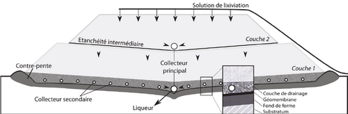 Par exemple, depuis les années 1970, la lixiviation - opération qui consiste à dissoudre les éléments d'un minerai à l'aide d'un solvant (acide sulfurique ou cyanure par exemple) - se pratique directement sur place, dans des mines d'or, de cuivre ou d'uranium. On disperse alors une substance qui dissout le minerai, afin de récupérer en plus grande concentration l'élément recherché. Les tas de minerais aspergés reposent sur des revêtements, qui sont sujets à des fuites ou des ruptures, alors qu'auparavant, cette étape se déroulait dans des bassins d'usines de traitement, bien mieux isolés des écosystèmes.